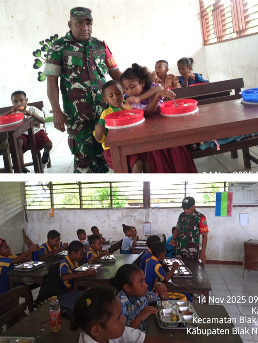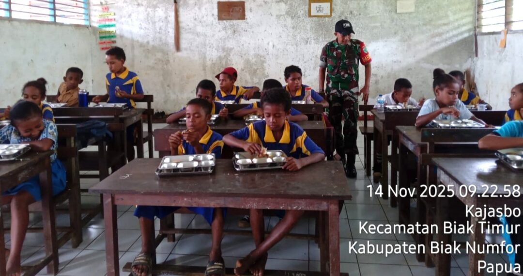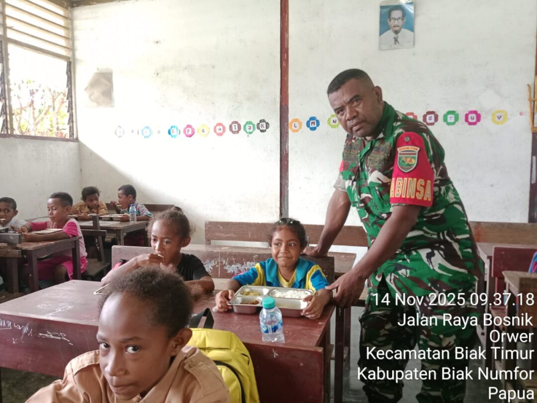 Biak Timur – Bintara Pembina Desa (Babinsa) Koramil 1708-01/BK Posramil 01 Biak Timur Serka F. Sombuk, Serka Dodik Fitrianto, Sertu Wahyu Hendro Patrias Setiawan, Kopka Absalom Dimara dan Kopka Yosep Silaka mendampingi pendistribusian Makanan Bergizi Gratis (MBG) kepada siswa- siswi ke sekolah di Wilayah Distrik Biak Timur, Kabupaten Biak Numfor, Papua, Jumat (14/11/2025).