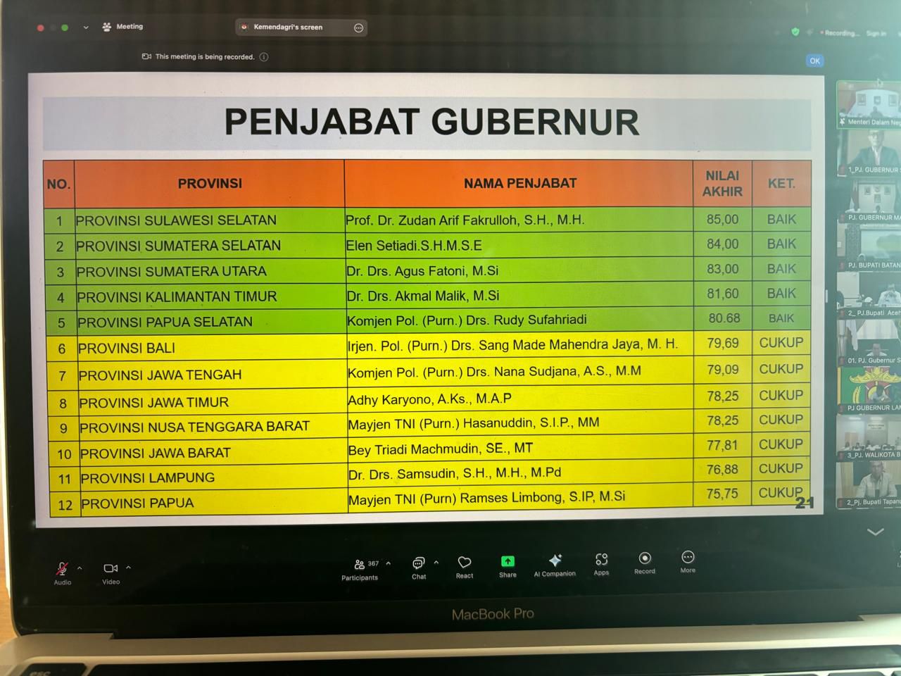 Prof Zudan memiliki nilai evaluasi 85 dengan kategori BAIK. Urutan kedua ditempati Pj Gubernur Sumatera Selatan Elen Setiadi (84/BAIK), urutan ketiga Pj Gubernur Sumatera Utara Dr Agus Fatoni (83/Baik). Sementara urutan keempat Pj Gubernur Kaltim Akmal Malik (81,60/Baik) dan posisi kelima Pj Gubernur Papua Selatan Rudy Sufahriadi dengan nilai 80,68 dengan kategori Baik.