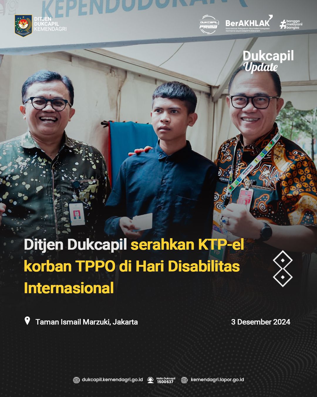Ditjen Dukcapil Kemendagri dinilai memainkan peran penting dalam mendukung inklusi penyandang disabilitas dengan menyediakan layanan administrasi kependudukan yang setara dan non-diskriminatif. “Kami bertanggung jawab untuk mendata penyandang disabilitas dan memberikan dokumen kependudukan seperti perekaman dan cetak KTP-el, ganti foto KTP, dan aktivasi Identitas Kependudukan Digital bagi kaum difabel. Ini adalah bentuk pelayanan yang inklusif dan setara, memastikan bahwa setiap orang, terlepas dari kemampuan fisik atau mental, mendapatkan hak yang sama,” kata Sesditjen Dukcapil Hani Syopiar Rustam pada puncak peringatan HDI yang dihadiri Wakil Presiden Giubran Rakabuming Raka di TIM, Jakarta, Selasa (3/12/2024).