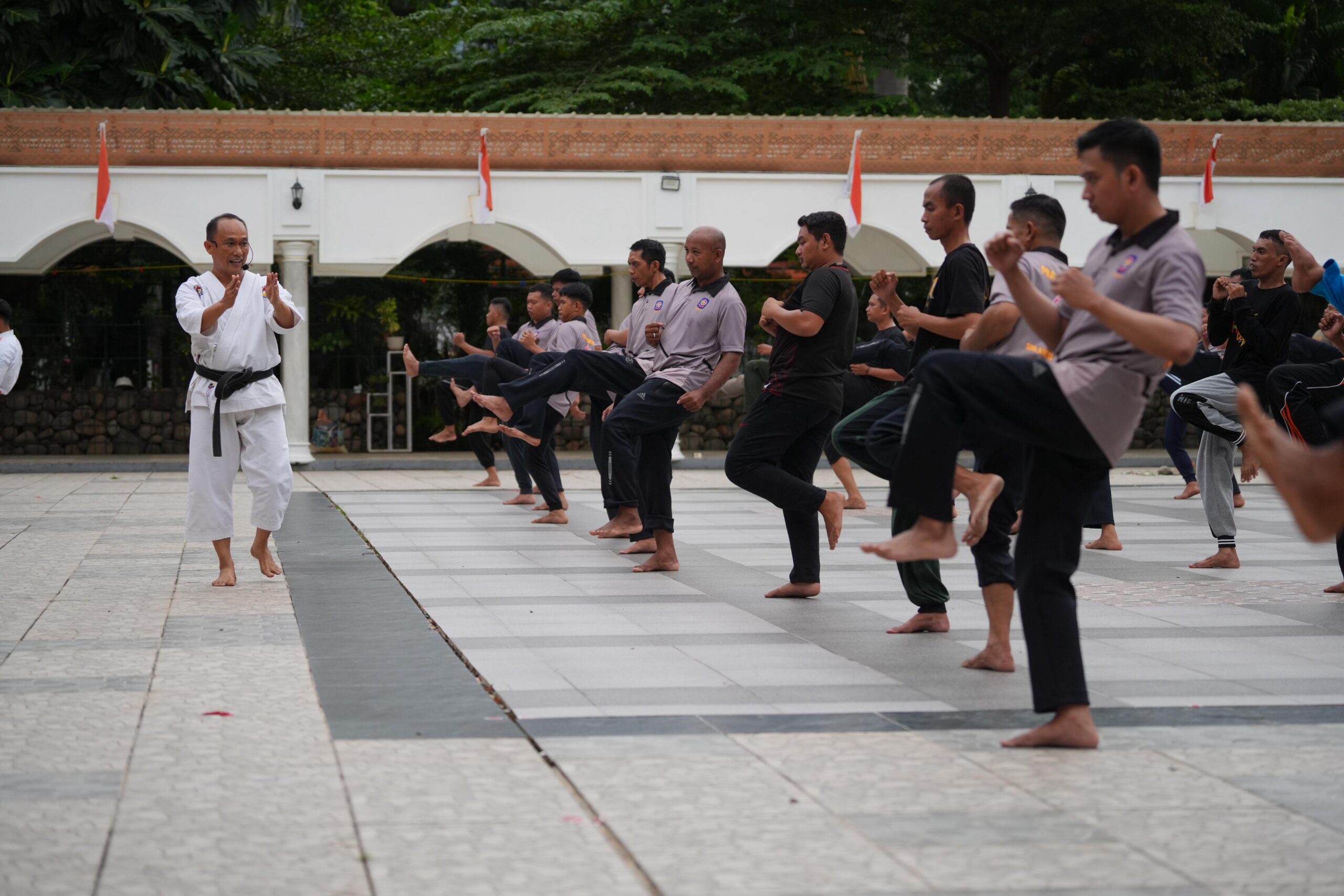 Prof Zudan begitu serius memimpin latihan karate di sore hari. Sesekali ia juga kunjungi peserta untuk mengajarkan sejumlah teknik karate yang dimilikinya, mulai dari kuda-kuda, pukulan hingga tendangan.