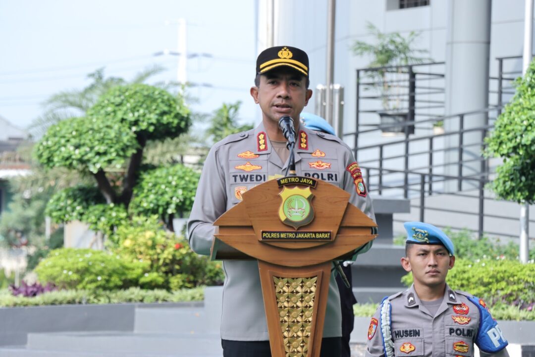 Jakarta Barat, wberita.com ! Kapolres Metro Jakarta Barat Kombes Pol Twedi Aditya Bennyahdi, S.Sos., S.I.K., M.H memimpin apel pagi jam pimpinan di halaman Polres Metro Jakarta Barat, Selasa (8/7/2025).