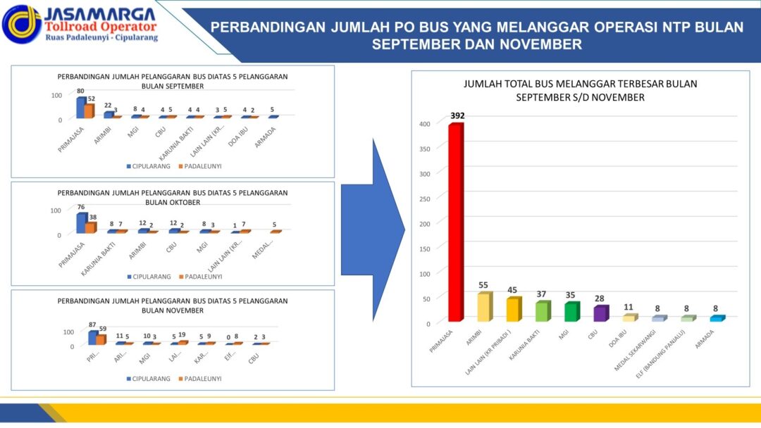 Data PT Jasa Marga (Oktober 2024), tercatat selama bulan september 2024 jumlah total bus melanggar naik turun penumpang di Tol Padaleunyi (Padalarang-Cileunyi) dan Tol Cipularang (Cikampek-Purwakarta-Padalarang) adalah PO Primajasa sebanyak 393 kali, PO Arimbi (55), kendaraan pribadi (45), PO Karunia Bakti, PO MGI (35), PO CBU (28), PO Doa Ibu (11), PO Medal Sekarwangi (8).