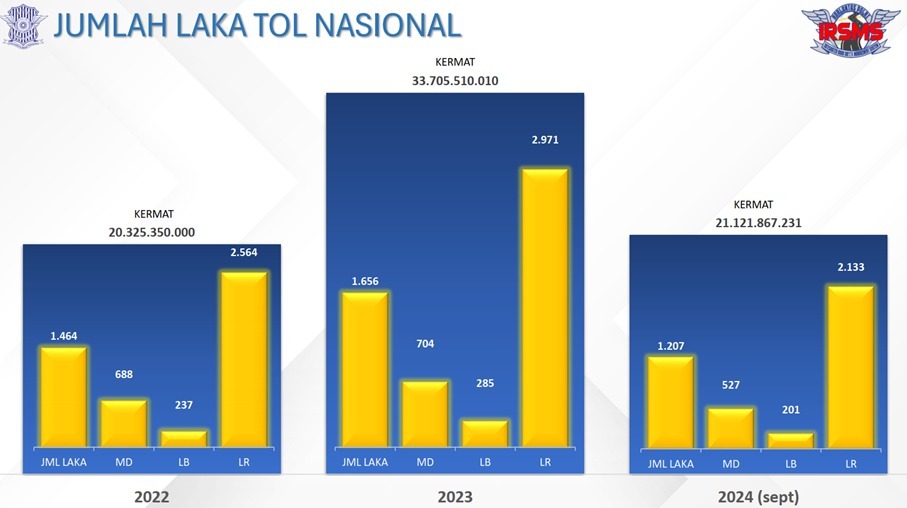 Jumlah kecelakaan di jalan tol meningkat. Data Korlantas Polri (Oktober 2024), tercatat di tahun 2022 ada 1.464 kejadian kecelakaan lalu lintas dengan korban 688 meninggal dunia, 237 luka berat dan 2.564 luka ringan. Ada peningkatan di tahun 2023, terjadi 1.565 kecelakaan dengan korban 704 meninggal dunia, 285 luka berat dan 2.971 luka ringan.