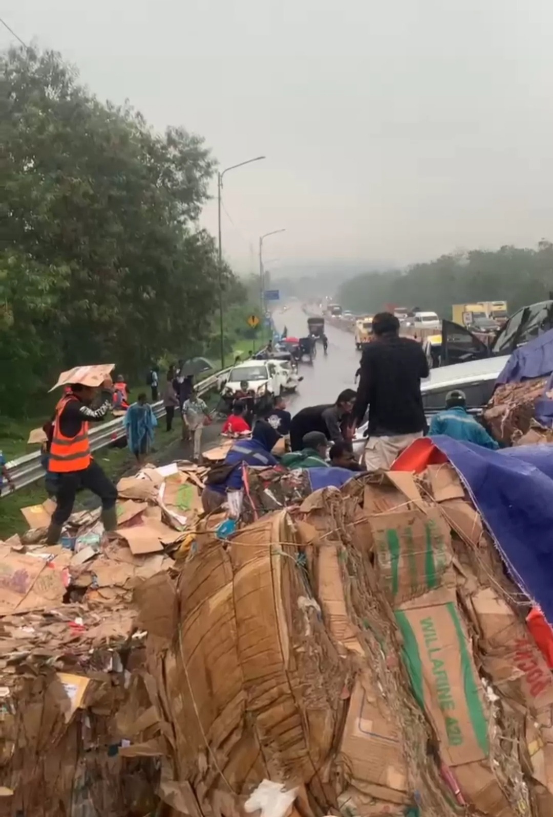 Dalam video yang beredar di media sosial, kondisi kendaraan yang bertabrakan terlihat ringsek dan bertumpuk di bahu jalan, sementara proses evakuasi korban sedang dilakukan.