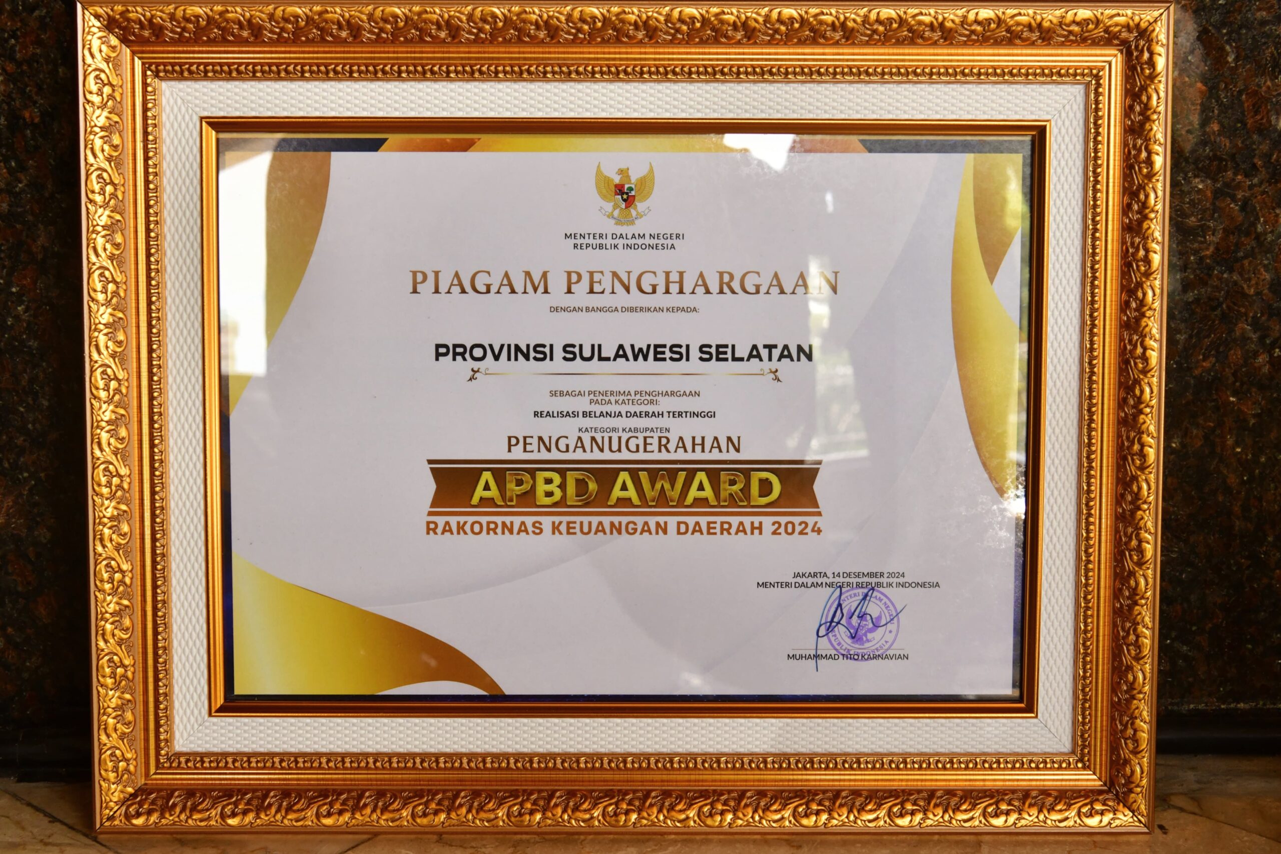Pemprov Sulsel meraih Penganugerahan APBD Award pada kategori Realisasi Belanja Daerah Tertinggi dan kategori Realisasi Belanja Terhadap Pendapatan Tertinggi.