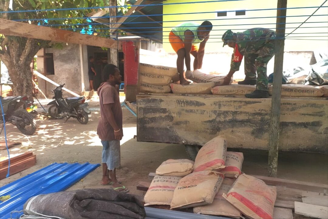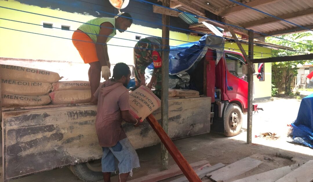 SUPIORI – Babinsa Koramil 1708-06/Supiori Utara, Koptu Imanuel Rumere membantu warga binaannya menurunkan semen untuk pembangunan rumah warga di Kampung Amyas, Distrik Supiori Barat, Kabupaten Supiori, Papua, Jumat (14/11/2025).