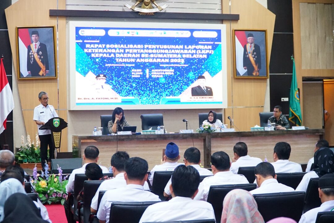 Palembang – Sekretaris Daerah (Sekda) Provinsi Sumatera Selatan (Sumsel) S. A. Supriono membuka Sosialisasi Pedoman Umum Penyusunan Laporan Keterangan Penanggungjawaban (LKPJ) Bupati/Walikota se-Sumsel Tahun Anggaran (TA) 2023. Kegiatan ini diselenggarakan di Auditorium Bina Praja, Kantor Gubernur Sumatera Selatan, Palembang, Sumatera Selatan, Rabu (31/1/2024).