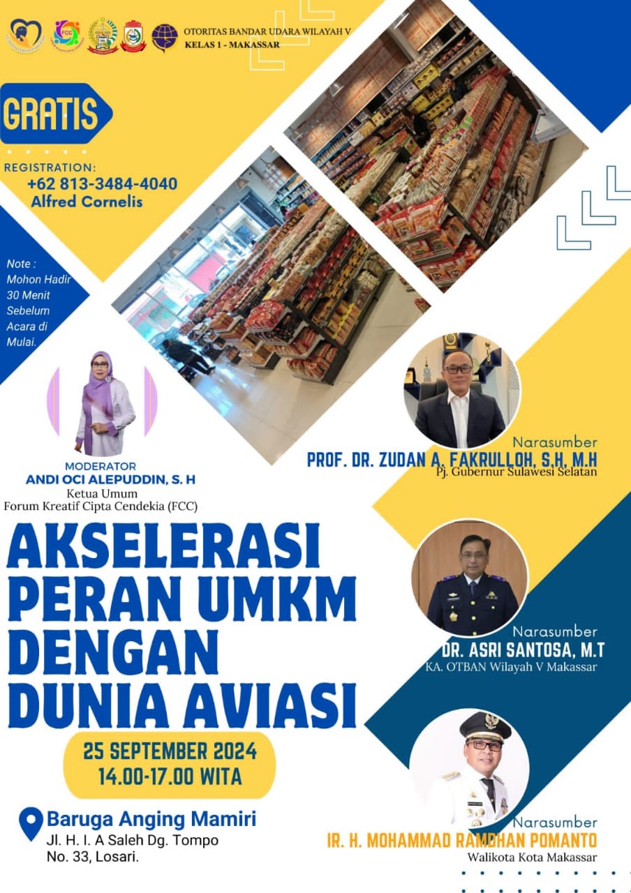 Kami berharap adanya kerjasama yang baik yang dapat berguna bagi semua pihak. Acara ini akan dipandu oleh ibu Andi Oci Alepuddin, SH ketua Umum FCC Forum kreatif Cipta Cendekia yang sangat berpengalaman dalam membantu pengembangan UMKM untuk propinsi Sulawesi Selatan dan daerah daerah lain di seluruh Indonesia. Untuk pendaftaran peserta UMKM atau masyarakat yang ingin ikut dapat mendaftar diri dengan no telepon yang ada di brosur.