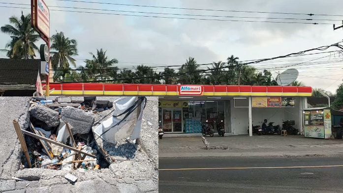 JEMBRANA, wberita.com ! Gorong-gorong di depan toko moderen berjaringan (Alfa Mart), Banjar Pasar, Desa Yehembang, Kecamatan Mendoyo, Jembrana, kondisinya jebol.