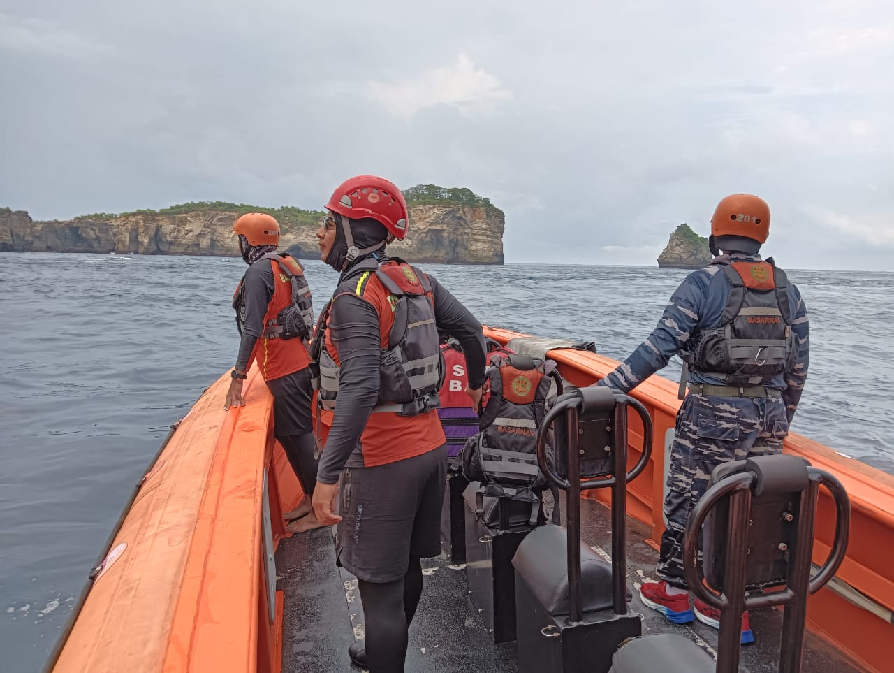 Tim SAR Unit Siaga Nusa Penida saat melakukan pencarian wisatawan yang terseret arus di Pantai Diamond, Selasa (27/5/2025).