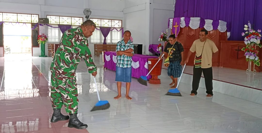 Kegiatan tersebut, dilaksanakan usai ibadah Minggu. Babinsa bersama jemaat bergotong-royong membersihkan bagian dalam gereja agar tetap rapi dan nyaman digunakan.