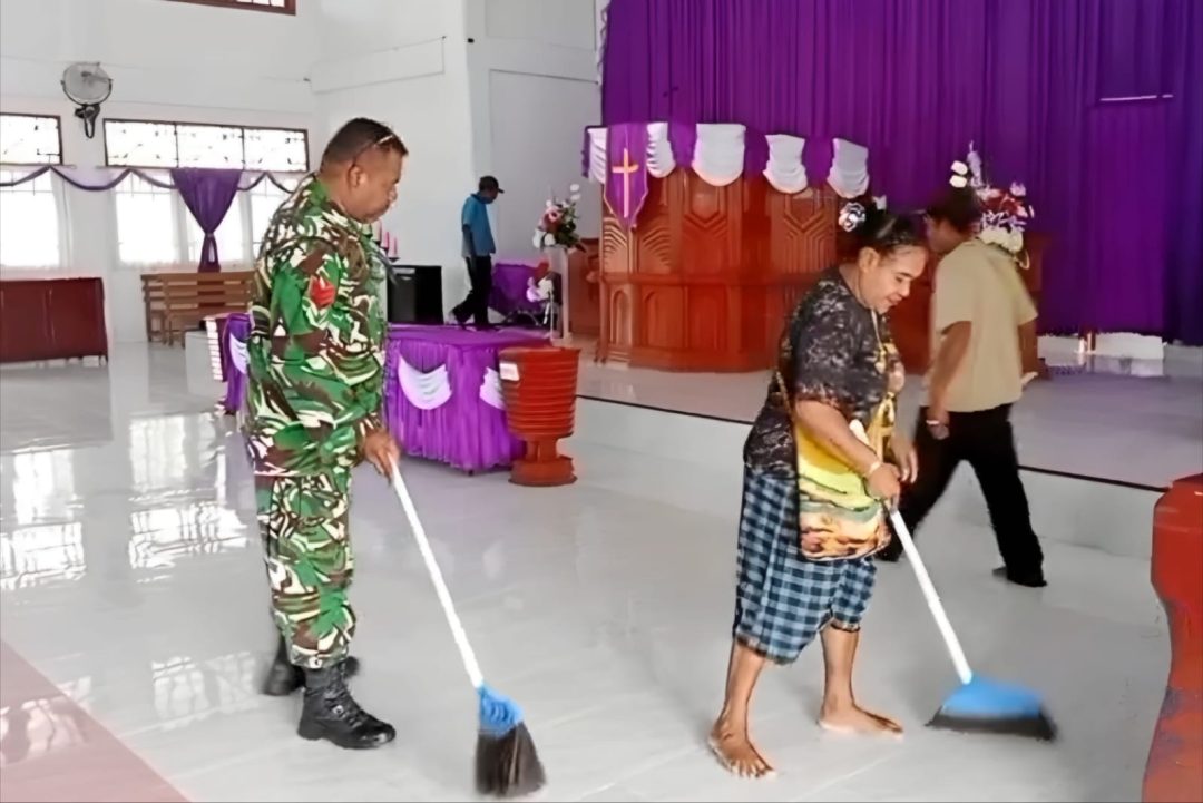 “Kebersihan gereja harus selalu dijaga karena ini adalah tempat ibadah. Kalau bersih, jemaat juga merasa nyaman saat beribadah,” ujar Babinsa.